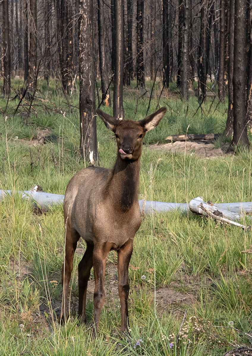 Ještě jeden raní obrázek jelena wapiti. Tentokrát laň, která se nápadně olizuje. Zda olizování vyjadřuje chuť na čerstvou trávu nebo jiné chutě není jasné. Možná, že se laň jen obyčejně čistí.