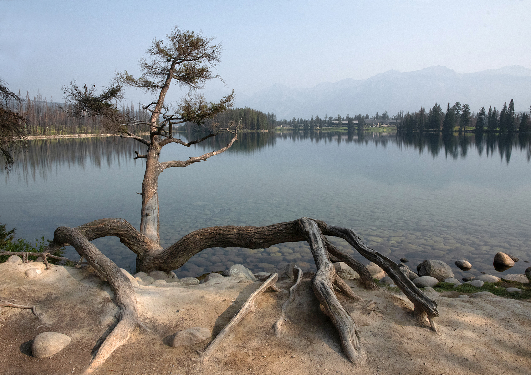 Autem jsme dojeli až k prázdnému parkovišti kousek od břehu jezera. Hned u parkoviště nás zaujala překrásná borovice s pavoučími kořeny na břehu jezera.