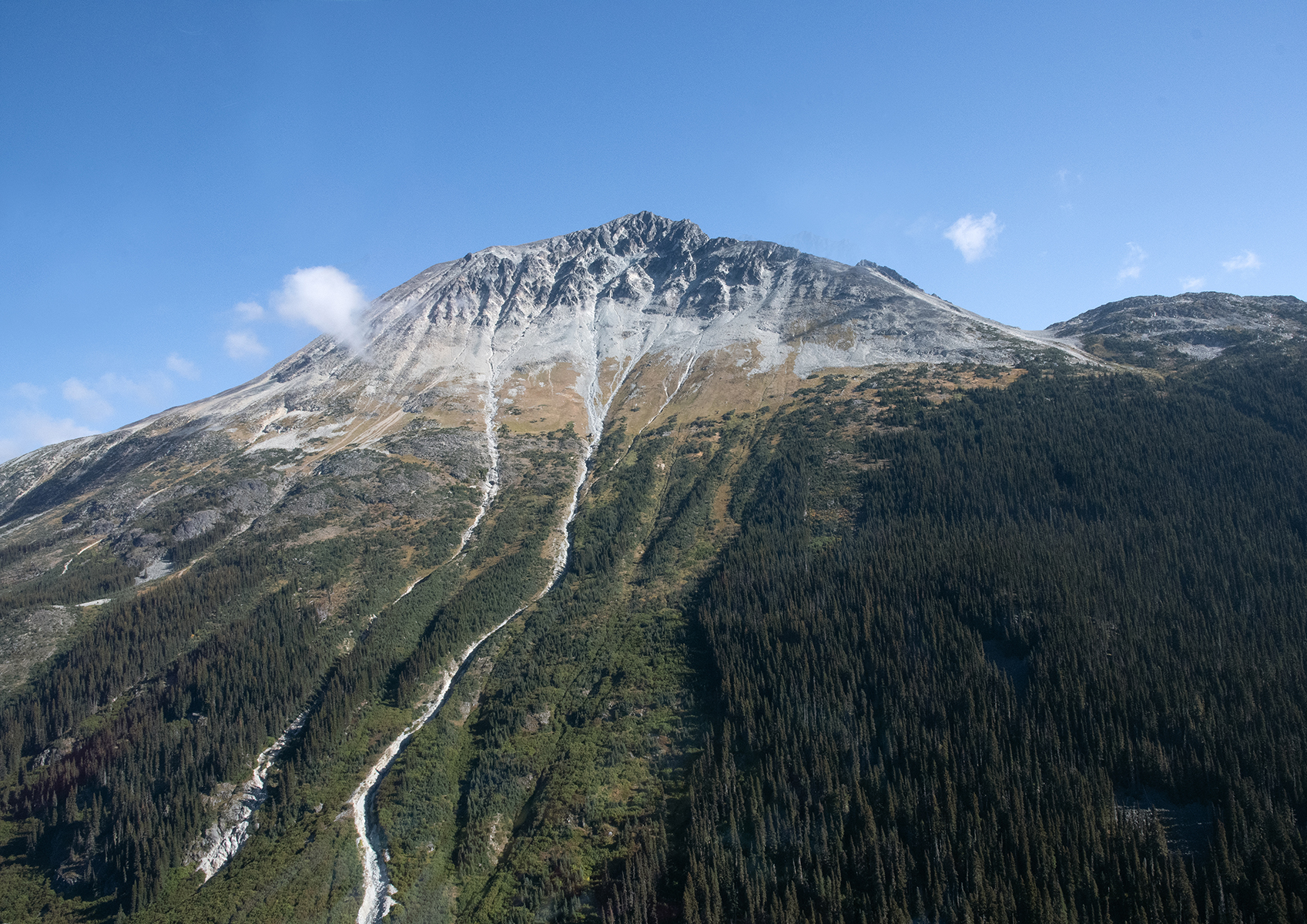 Na fotografii je západní stěna Wedge Mountain. Musím uvést, že určit přesnou lokalitu této i dalších fotografii z vyhlídkového letu jsem byl schopen jen s laskavou pomocí Blackcomber Helicopters.