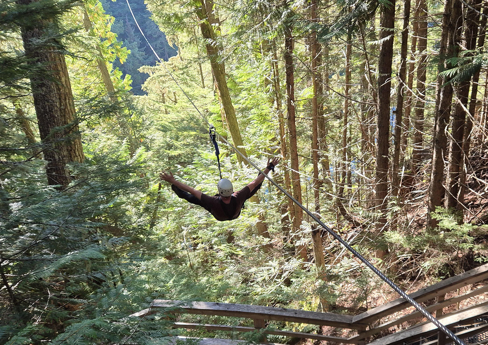 Když šlápnete do prázdna nebo se odrazíte, tak vás stejně drží kotevní lano a přidržování se rukama je spíše symbolické nebo reflexní. Není tedy žádný problém zdvihnout pro větší efekt ruce vzhůru. Takto jedete asi prvních padesát metrů, ale pak začnete částečně rotovat nebo se natážet na stranu. Měl jsem na ruce Gopro kameru a myslel jsem, že natočím nějaké super video, ale byla z toho jen taková točící se mixáž. Když jsme se průvodců ptal, zda natážení jde nějak korigovat, tak se usmáli a řekli, že částečně nějak možná ano...