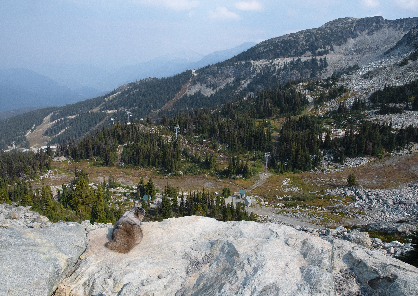 U vrcholové stanice Blackcomb Gondola je nevelká téměř rovná plošina, na které jsou postaveny vrcholové stanice hned 4 lanových dráh a navíc poměrně velká budova Rendezvous Lodge. Nás na této plošině však jako první zaujali zdejší svišti, kteří nebyli skoro vůbec plaší. S jedním z nich se společně koukáme do údolí Blackcomb Creek na západní straně Mt.Blackcomb.