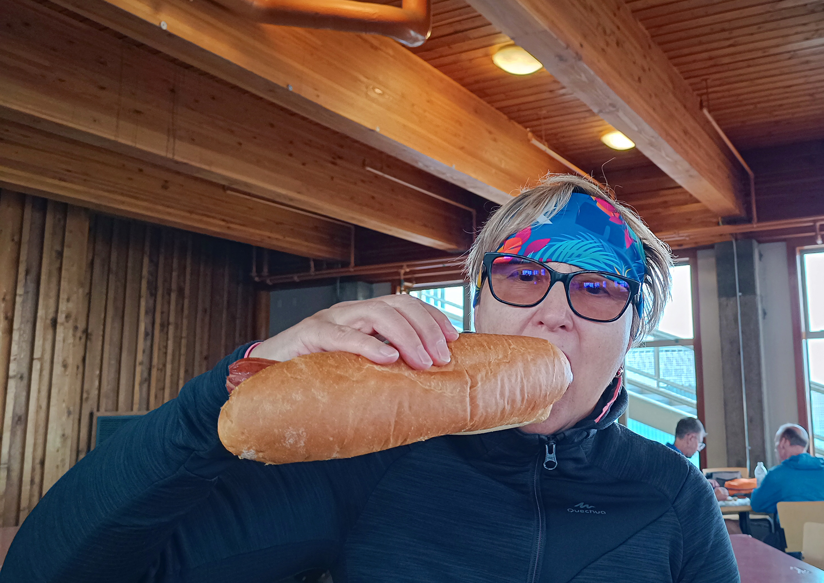 U vrcholové stanice Peak 2 Peak si na oběd dáváme skutečně obří hotdog.