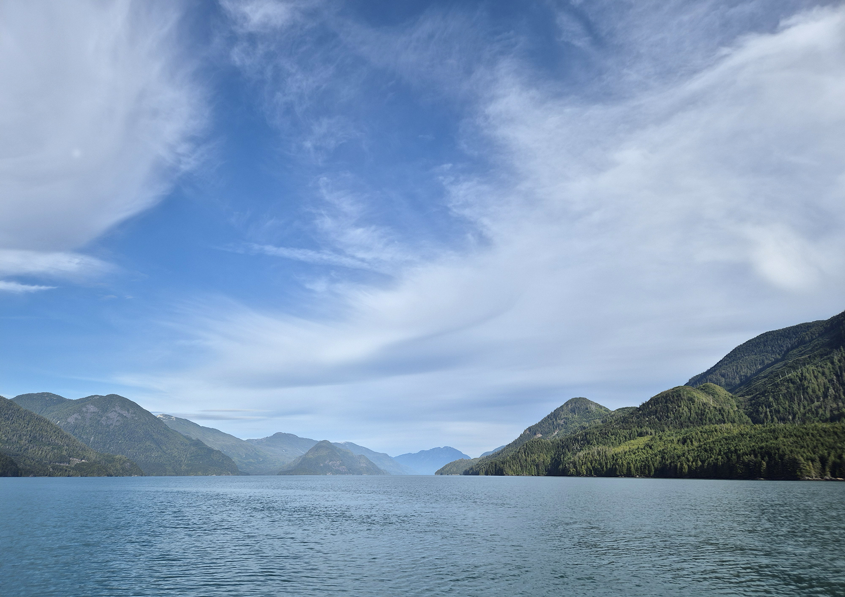 Chvílemi se záliv rozšiřuje ale většinou se jeho šířka pohybuje kolem 2,5 km. Zato jeho délka je úctyhodných 125 km a je jedním z nejdelších zálivů na území Britské Kolumbie. Záliv je napájen řekou Klinaklini a stejnojmenným ledovcem. Fotku focena po směru jízdy, k východů a další fotografie fotku focenou v proti směru a proti slunci.