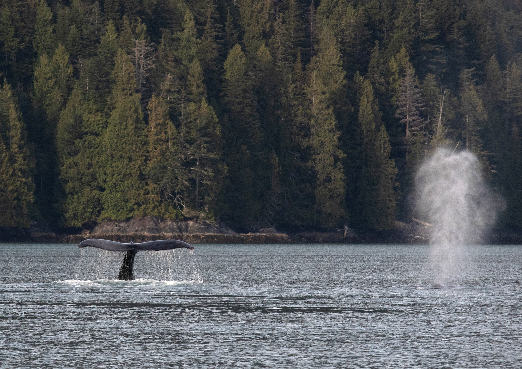 Keporkaky potkáváme i v zálivu Knight Inlet. Většinou však zahlédneme jen vyfouknutí mlžného gejzíru. Párkrát se nám podaří vyfotit i šplouchnutí ocasem, než se velryby zanoří. Na tomto obrázku jsme současně vyfotili ocas i gejzír, samozřejmě dvou různých keporkaků.