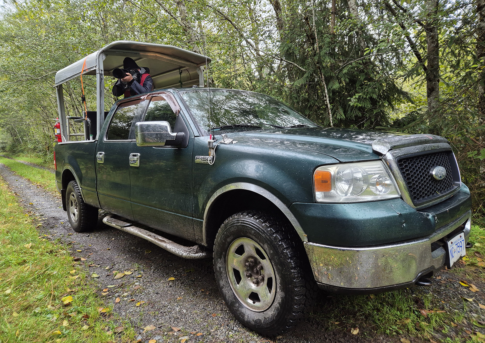 Náš poslední výlet se poněkud nadneseně jmenoval Trail above the clouds. Přepluli jsme lagunu, nasedli do džípu a jeli tentokrát až za pozorovatelny medvědů, kam to šířka cesty dovolila. Sedl jsem si na korbu, abych mohl fotit, pokud bychom potkali zajímavý objekt.
