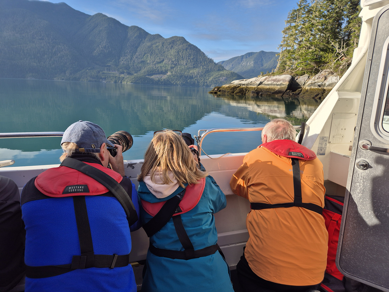 Jakmile jsme se přiblížili na vzdálenost přiměřenou ohniskové vzdálenosti našich objektivů, tak jsme zaklekli do "bojové polohy" a čekali, zda se medvědice objeví na pobřeží.