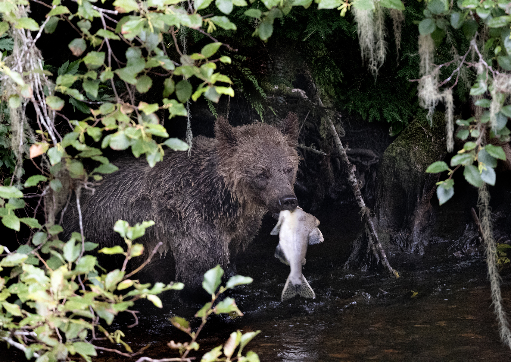 Medvědice konečně chytla lososa. My jsme se dozvěděli, že množstí medvědů je úměrné množství lososů a množství lososů je uměrné množství srážek a tím i výšce hladiny zdejších vod. V tomto roce se podle průvodců děště moc nepochlapily a tudiž ani medvědů u říčních pozorovatel bylo málo. Tito dva medvědi byli vlastně jediní, které jsme zde viděli u řeky lovit lososy. Ale takový je život a odhadovat konkrétní dobu tahu lososů je vždy sázka do loterie.