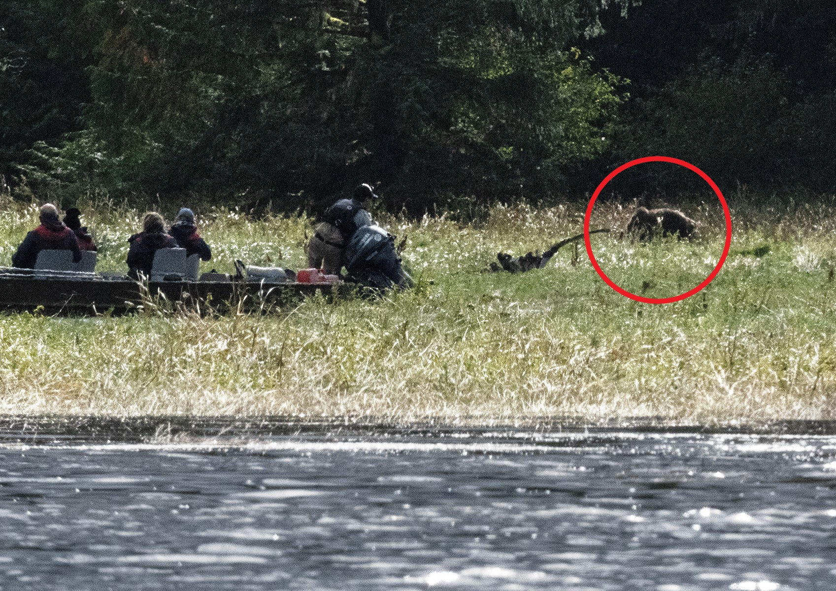 V první chvíli registrujeme spíše stojící člun, jehož osazenstvo stále civí jedním směrem. Pak v trávě rozpoznáme hnědošedou hromadu chlupů. Medvěd.
