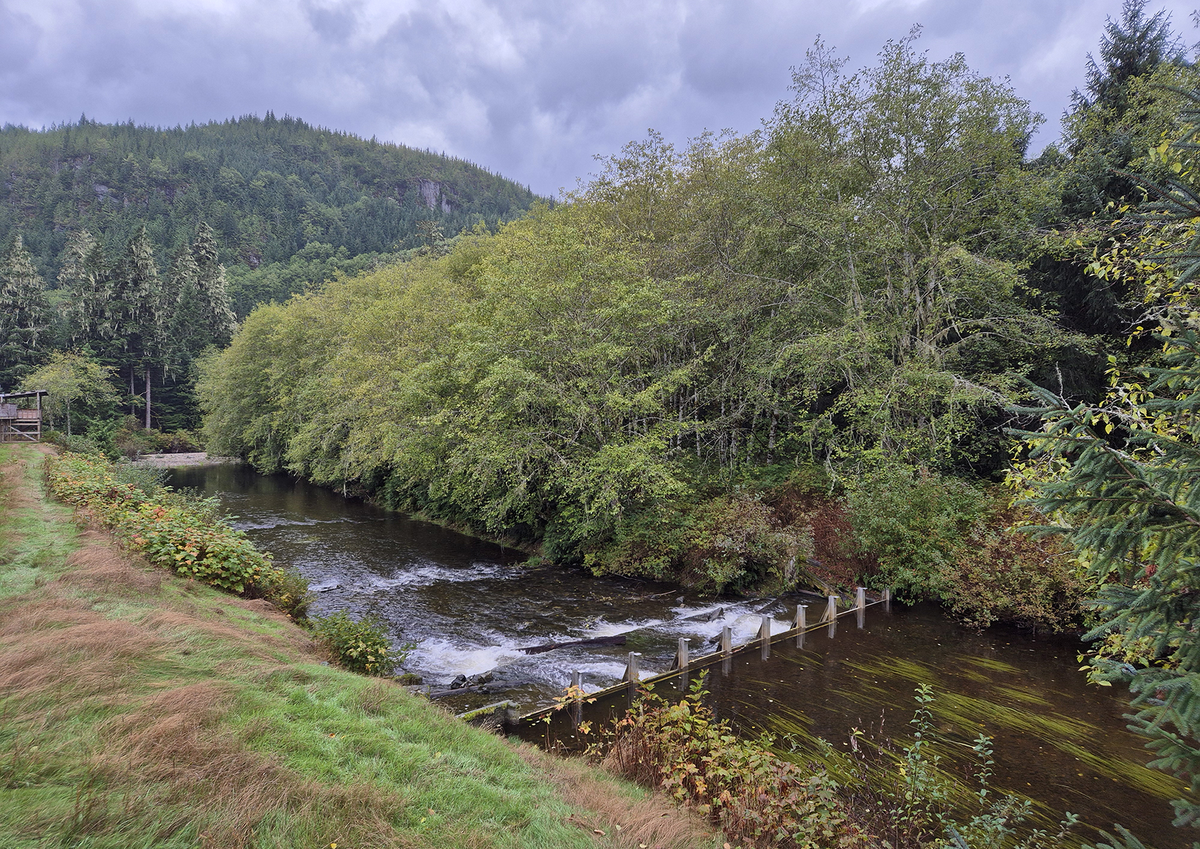 Poslední den v Knight Inlet Lodge jdem ještě naposled zkusit štěstí na pozorovatelnu, tentokrát pozorovatelnu Weir, která je vlastně takové dvojče pozorovatelny Finger, neboť jsou spolu spojeny asi 30 m dlouhým dřevěnym můstkem. Výhled je pěkný, ale medvědi nikde. Zkrátka není déšť, není dost vysoká hladina řeky, nejsou lososi a tudiž nejsou ani medvědi.
